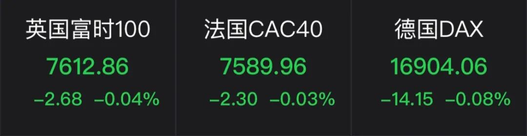 欧洲三大股指小幅下跌,德国DAX指数跌0.08%报16904.06点,法国CAC40指数跌0.03%报7589.96点,英国富时100指数跌0.04%报7612.86点。