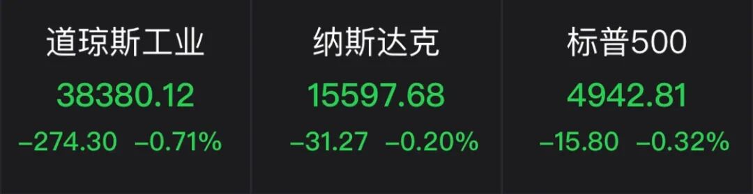 美国三大股指全线收跌,道指跌0.71%报38380.12点,标普500指数跌0.32%报4942.81点,纳指跌0.2%报15597.68点。