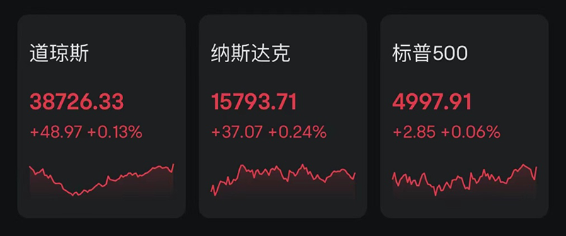 当地时间周四,美股集体收涨。截至收盘,道指收涨48.97点,涨幅为0.13%,报38726.33点;纳指涨37.07点,涨幅为0.24%,报15793.71点;标普500指数涨2.85点,涨幅为0.06%,报4997.91点。