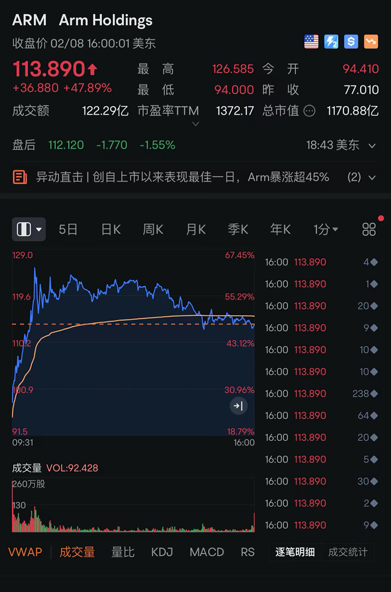 芯片巨头Arm一度涨超60%,最终收涨47.89%。当地时间2月7日,Arm公布的最新财报显示,公司第三财季营收8.24亿美元,同比增长14%,高于分析师预期的7.6亿美元;调整后运营利润3.38亿美元,高于分析师预期的2.744亿美元。同时,公司第四财季和全财年业绩指引也都超出预期。