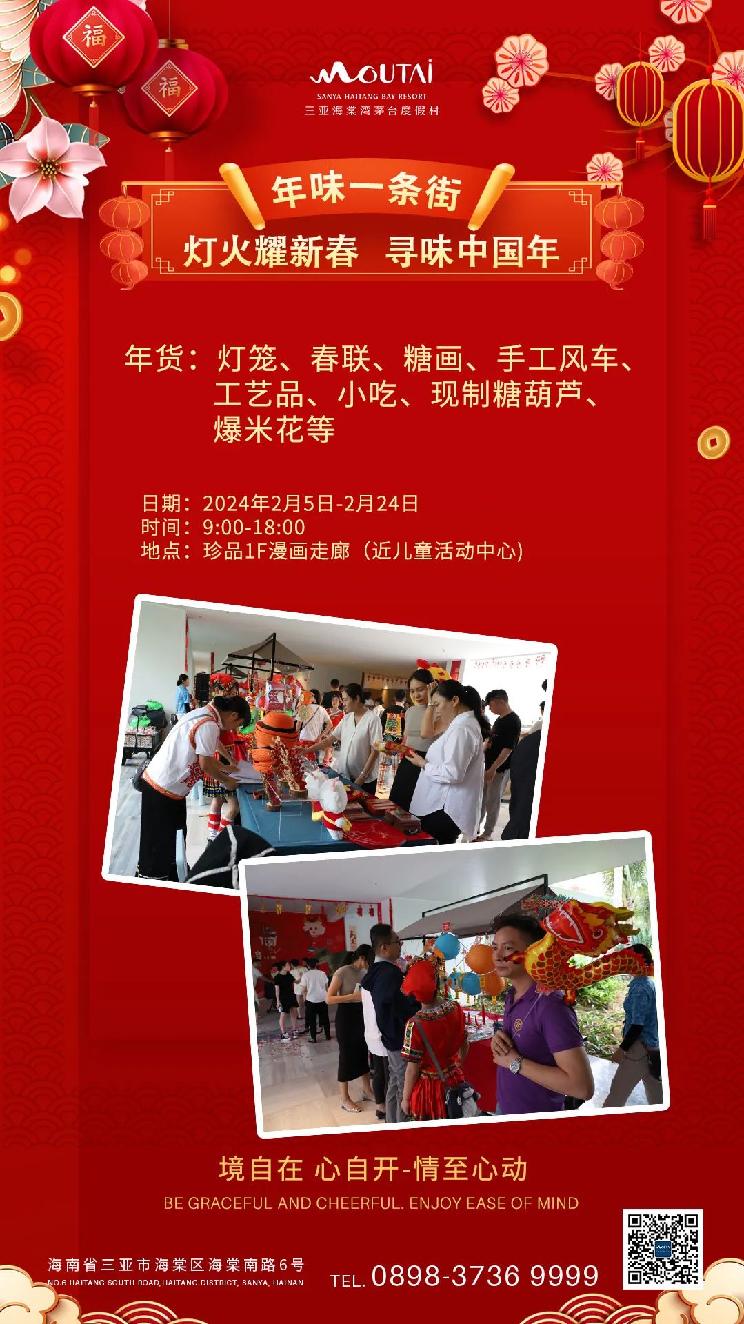 2月14日,三亚海棠湾畔,茅台度假村打造的“年味一条街”热闹非凡。现场摊点、装饰、道具年味十足,不少游客在摊位上做糖画、DIY手工风车、品尝特色小吃,度假村内人气高涨,更迎来接待高峰。