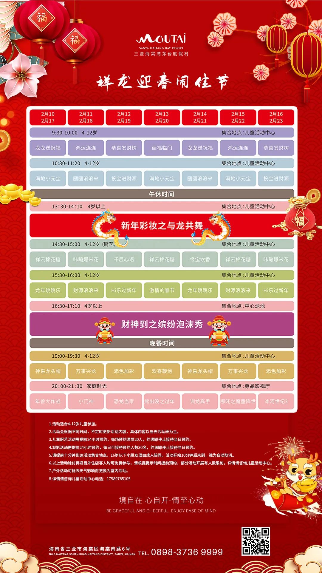 据悉,春节期间,茅台度假村还将全天在酒店内的儿童活动中心、中心泳池、尊品影视厅固定开展“祥龙迎春闹佳节”主题活动,活动类别丰富、花样百出,既有传统文化体验,更有亲子欢乐互动,活动时间将持续至大年十五元宵节。
