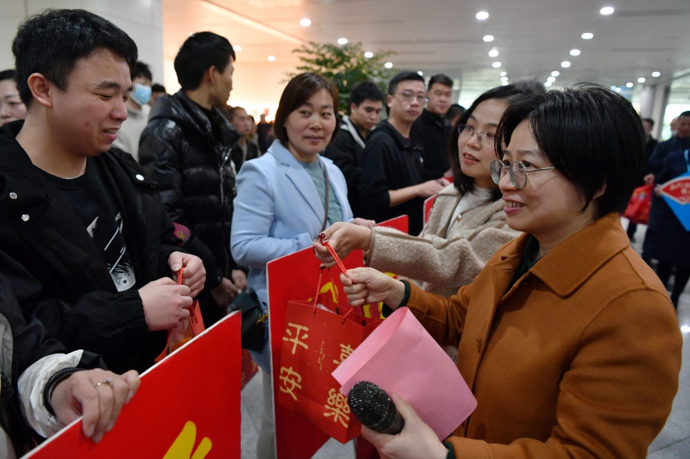 2024年2月15日,福州市人社部门工作人员(前右)向乘坐包机抵榕的返岗务工人员送上新春大礼包。当日,来自云南、贵州的364名返岗务工人员乘坐的飞机降落在福州长乐国际机场。这是2024年春节后福州市人社部门通过免费包机接回的首批重点企业返岗务工人员。新华社记者 魏培全 摄
