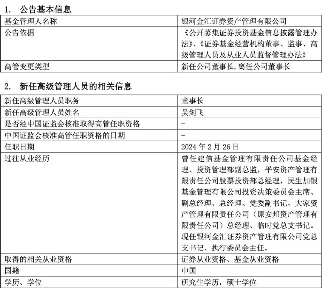 银河金汇证券资产管理有限公司(下称“银河金汇”)28日发布高级管理人员变更公告,吴剑飞获委任为公司新任董事长,任职日期自2024年2月26日起。原董事长刘冰因工作变动原因离任。