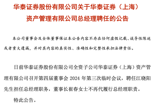 华泰证券发布公告称,其全资子公司华泰证券(上海)资产管理有限公司(下称“华泰证券资管”)聘任江晓阳担任总经理职务,董事长崔春不再代履行总经理职责。