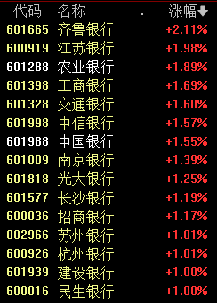 今天上午,银行板块表现活跃,齐鲁银行、江苏银行等个股涨幅居前。