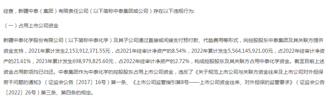 决定书显示,中泰化学及其子公司通过直接或间接支付预付款、代垫费用等形式,向中泰集团及其关联方提供资金支持,2021年至2023年合计发生资金高达84.17亿元。目前中泰集团已归还上述资金占用款项,但该行为已违反证监会相关规定。