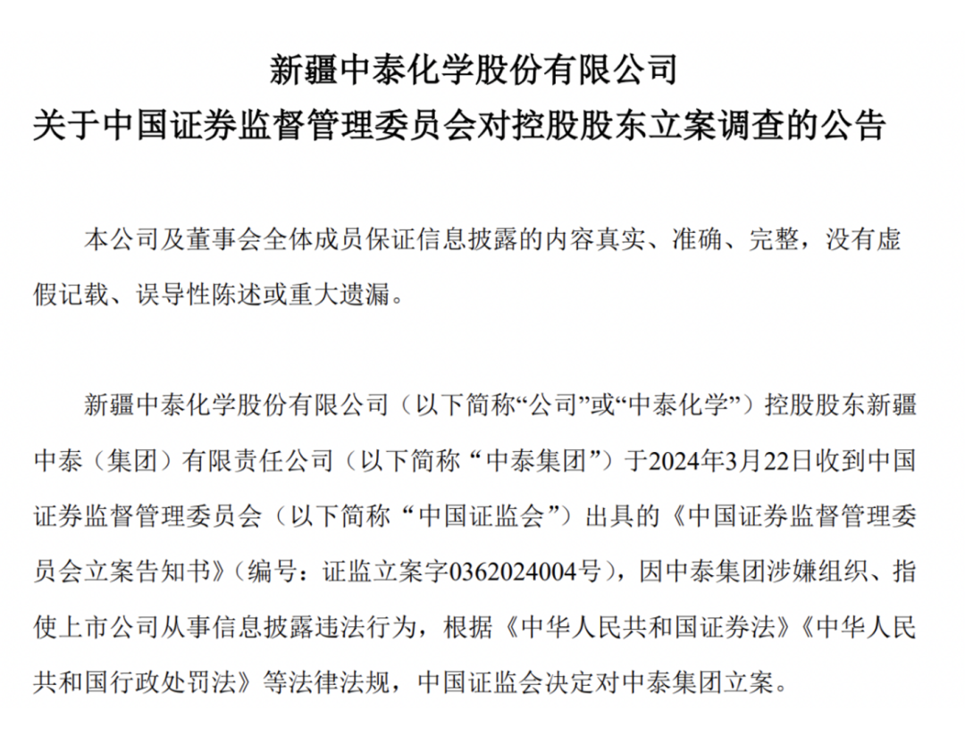 3月24日晚间,中泰化学披露公告称,因涉嫌组织、指使上市公司从事信息披露违法行为,中国证监会决定对公司控股股东中泰集团立案。