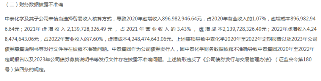 决定书还显示,中泰化学及其子公司未恰当选择贸易收入核算方式,导致其2020年—2022年累计虚增收入72.85亿元,进而导致中泰化学2020年至2022年定期报告以及2023年公司债券募集说明书等发行文件存在披露不准确问题。