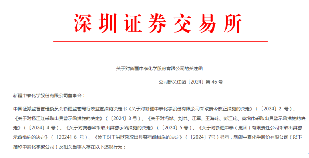 紧接着,深交所也于同日晚间向中泰化学下发关注函,对中泰化学及相关当事人启动纪律处分程序。