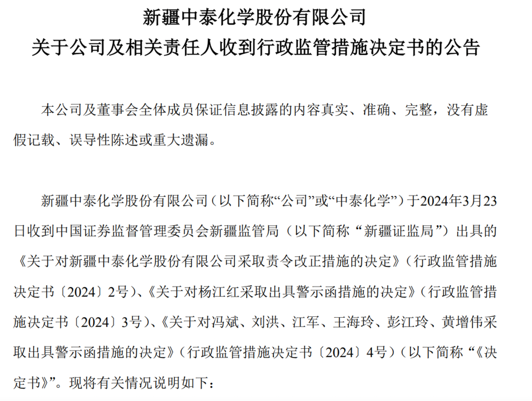 同时,新疆证监局还决定对中泰化学采取责令改正措施,并记入证券期货市场诚信档案;对中泰化学时任董事长杨江红等多人采取出具警示函的监管措施,并记入证券期货市场诚信档案。