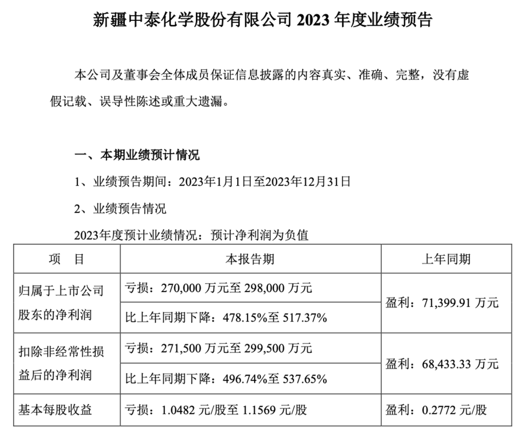 作为国内氯碱龙头企业,中泰化学2023年业绩表现不尽如人意。1月30日,中泰化学披露2023年度业绩预告,预计2023年归母净利润亏损27亿元至29.8亿元,同比下降478.15%至517.37%。