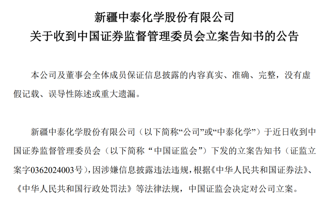 中泰化学称,本次立案事项系针对公司控股股东,公司日常生产经营活动正常开展,将持续关注该事项的进展情况。