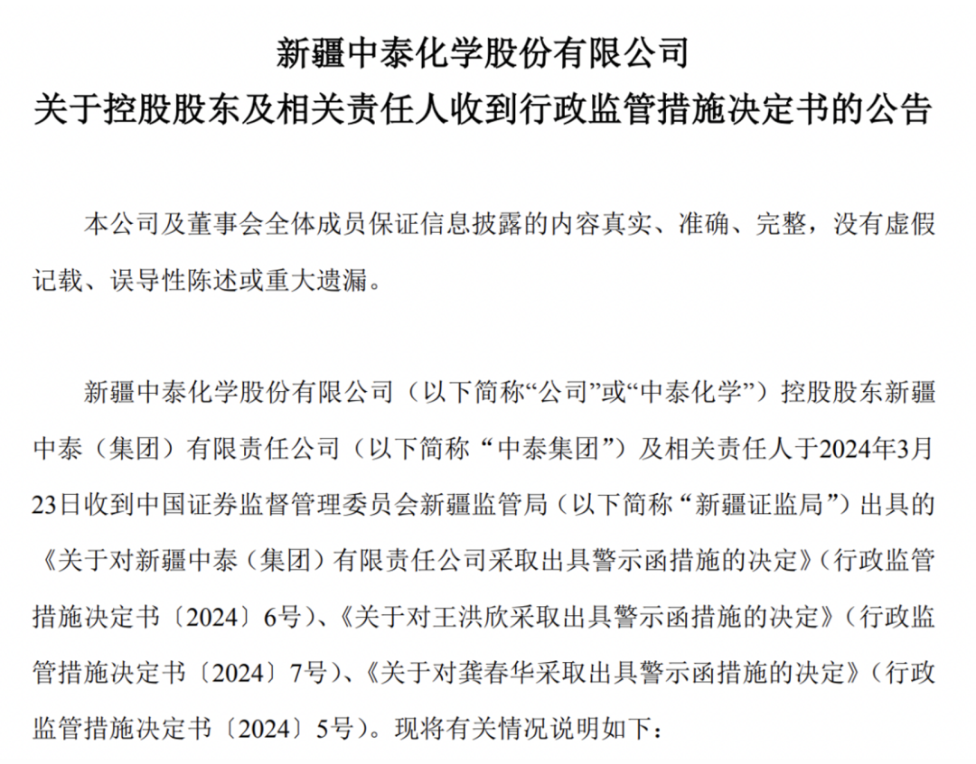 在被立案调查的同时,中泰化学及相关责任人、中泰集团及相关责任人分别收到新疆证监局出具的行政监管措施决定书(以下简称“决定书”)。