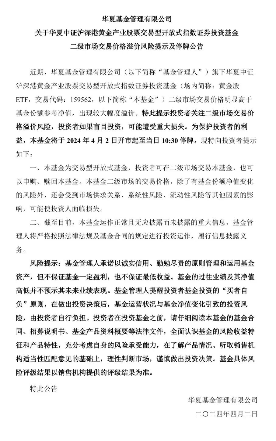 在4月1日涨停之后,华夏黄金股ETF已经有不小溢价。为了提醒投资者相关风险,华夏基金在4月2日发布风险提示称:华夏黄金股ETF二级市场交易价格明显高于基金份额参考净值,出现较大幅度溢价。特此提示投资者关注二级市场交易价格溢价风险,投资者如果盲目投资,可能遭受重大损失。为保护投资者的利益,基金于2024年4月2日开市起至当日10:30停牌。