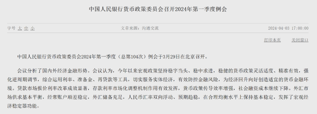 人民银行网站4月3日消息,中国人民银行货币政策委员会2024年第一季度(总第104次)例会于3月29日在北京召开。会议指出,要稳中求进、以进促稳、先立后破,不断巩固稳中向好的基础。精准有效实施稳健的货币政策,更加注重做好逆周期调节,更好发挥货币政策工具的总量和结构双重功能,着力扩大内需、提振信心,推动经济良性循环。