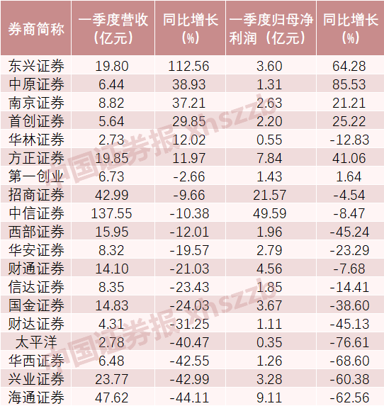 二是业绩下滑的券商之间分化明显。前述19家上市券商中,一季度营收同比下滑的券商,其营收同比降幅从2.66%到44.11%不等,降幅中位数在23%左右;一季度净利润同比下滑的券商差异更加明显,同比降幅最小的仅有4.54%,最大的则接近80%,降幅中位数在38%左右。