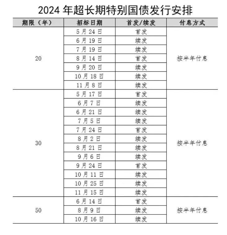 根据发行安排,今年将发行7只20年期超长期特别国债,其中首发2只、续发5只,最早于5月24日发行;将发行12只30年期超长期特别国债,其中首发3只、续发9只,最早于5月17日发行;拟发行3只50年期超长期特别国债,其中首发1只、续发2只,最早于6月14日发行。