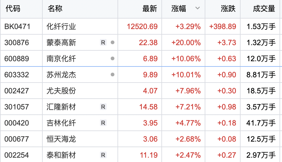 化纤行业板块走高 蒙泰高新、南京化纤、苏州龙杰涨停