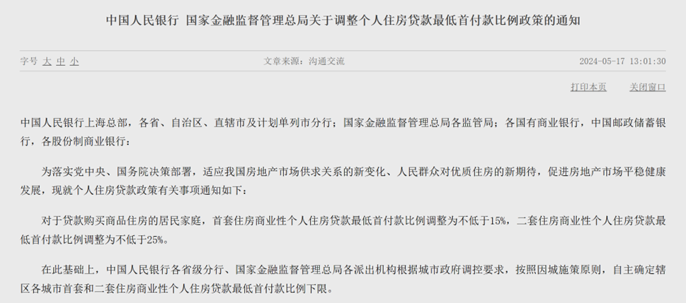 同日,中国人民银行、国家金融监督管理总局发布关于调整个人住房贷款最低首付款比例政策的通知。该通知明确,对于贷款购买商品住房的居民家庭,首套住房商业性个人住房贷款最低首付款比例调整为不低于15%,二套住房商业性个人住房贷款最低首付款比例调整为不低于25%。
