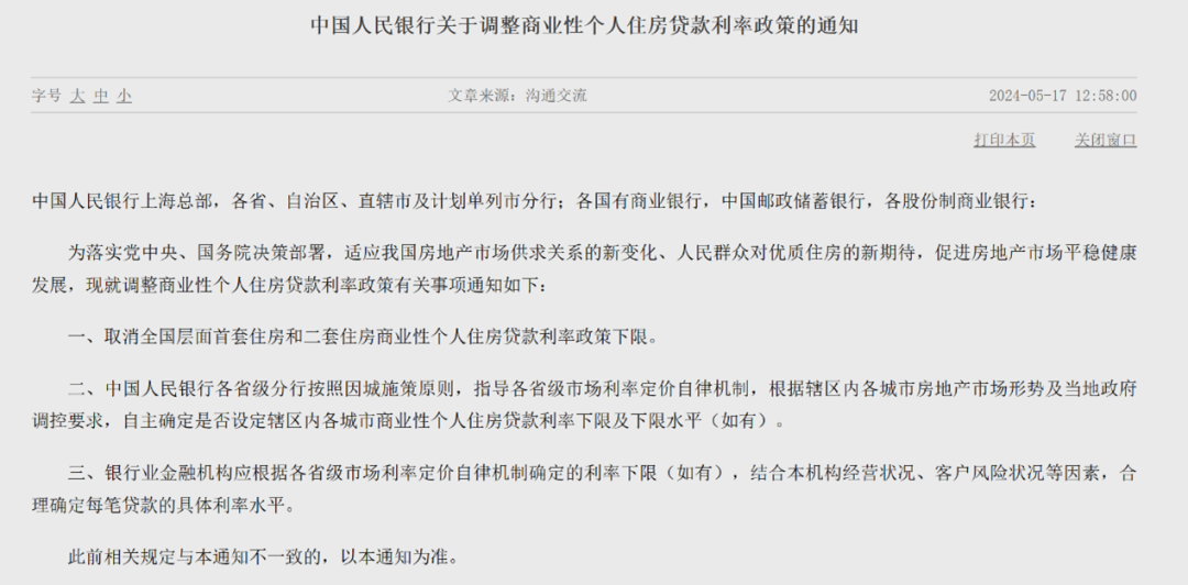 5月17日午间,人民银行网站消息,人民银行发布通知称,取消全国层面首套住房和二套住房商业性个人住房贷款利率政策下限。