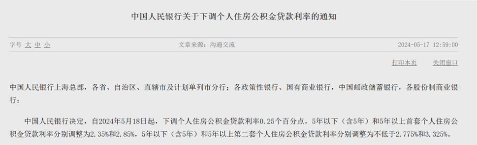 同日,中国人民银行发布关于下调个人住房公积金贷款利率的通知。通知明确,中国人民银行决定,自2024年5月18日起,下调个人住房公积金贷款利率0.25个百分点,5年以下(含5年)和5年以上首套个人住房公积金贷款利率分别调整为2.35%和2.85%,5年以下(含5年)和5年以上第二套个人住房公积金贷款利率分别调整为不低于2.775%和3.325%。