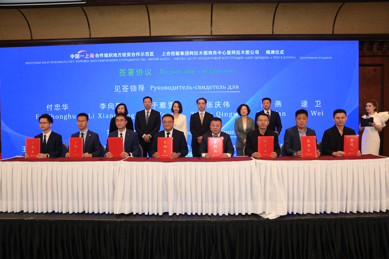 同一时间,在哈萨克斯坦阿拉木图,上合示范区阿拉木图商务中心暨上合控股阿拉木图公司揭牌,利用上合示范区国际平台优势,高效链接中哈两国经贸资源。中国物流集团上合国际物流公司、山东高速齐鲁号欧亚班列运营有限公司哈萨克斯坦分公司、传化上合(青岛)国际经贸有限公司、新华锦汽车贸易有限公司等首批企业签约入驻上合示范区阿拉木图商务中心,通过建立共享机制,加强信息共享、资源联动,依托上合示范区公共服务平台联合“出海”。