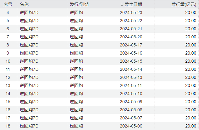 自5月第一个工作日起,央行公开市场逆回购操作量已连续18个工作日保持在20亿元的“地量”水平。不少专家表示,近期公开市场操作资金投放量较小,且央行逆回购余额低于历史同期水平,显示银行体系流动性处于充裕状态。