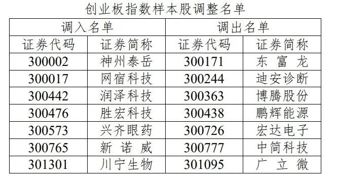 创业板50调入个股为神州泰岳、网宿科技、润泽科技、胜宏科技、江波龙;调出博腾股份、鹏辉能源、欧普康视、圣邦股份、华大九天。