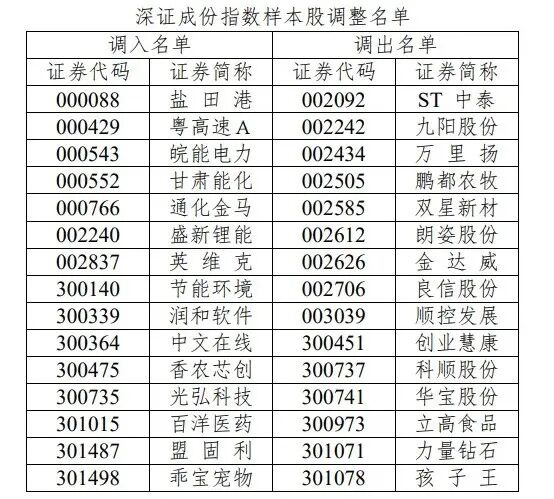 具体来看,深证成指将更换15只样本股。盐田港、粤高速A、皖能电力等个股调入深证成指,ST中泰、九阳股份、万里扬等被调出。