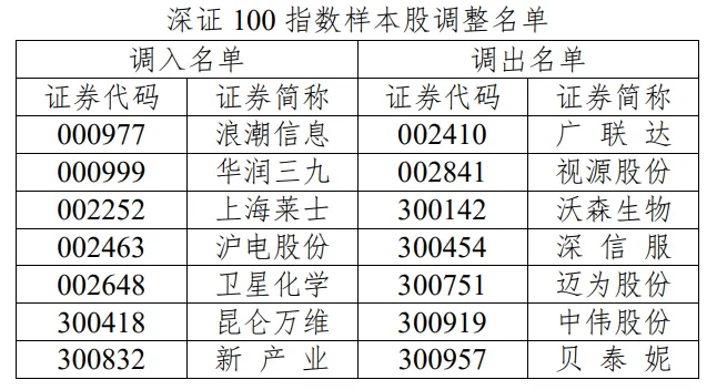除深证成指、创业板指、深证100核心指数外,深证50、深主板50、创业板50此次亦同步调整样本股。