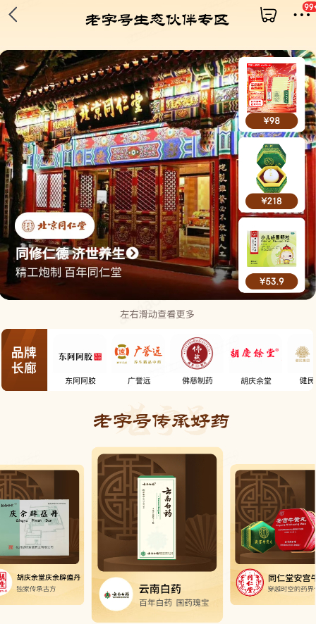 在专区内,汇集了同仁堂安宫牛黄丸、东阿阿胶块、达仁堂消湿丸、佛慈二陈丸、云南白药、广誉远龟龄集、胡庆余堂庆余辟瘟丹、龙牡壮骨颗粒等众多老字号精品药品。此外,专区内还展示了百年老字号企业的品牌文化、产品工艺等内容,帮助用户更深刻地了解这些品牌的文化和历史。同时,该专区还通过分类导购、品牌导购、跨品牌的场景导购及趣味科普等多种形式,激发用户兴趣、精准捕捉用户需求、帮助用户完成购药决策,并促成下单购买。