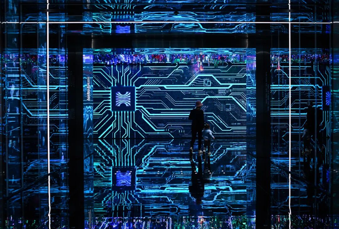 2021年1月7日,观众穿过深圳华强北博物馆以集成电路为图案的时光廊道。