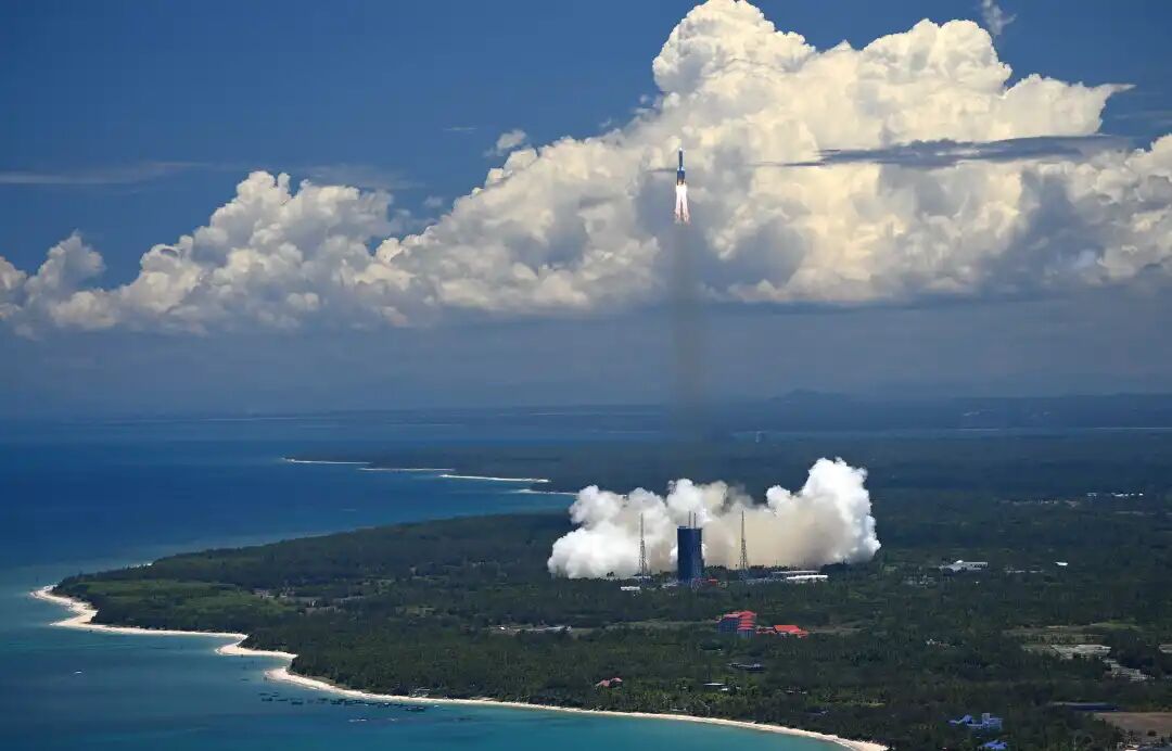 2020年7月23日,在海南中国文昌航天发射场,长征五号遥四运载火箭搭载执行首次火星探测任务的“天问一号”探测器升空。