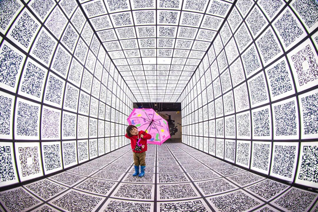 2017年4月6日,一名小朋友在江苏南京一商场的“二维码隧道”内玩耍。