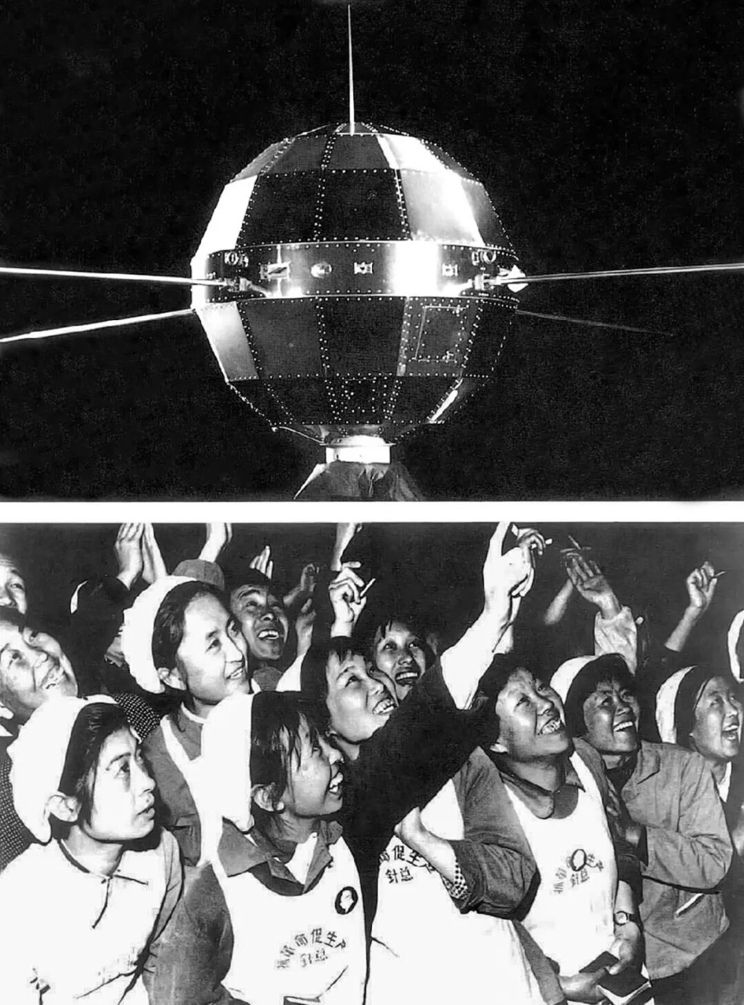 1970年4月24日,中国第一颗人造地球卫星“东方红一号”成功发射。上图:中国第一颗人造地球卫星“东方红一号”;下图:人们争相眺望通过北京上空的“东方红一号”。