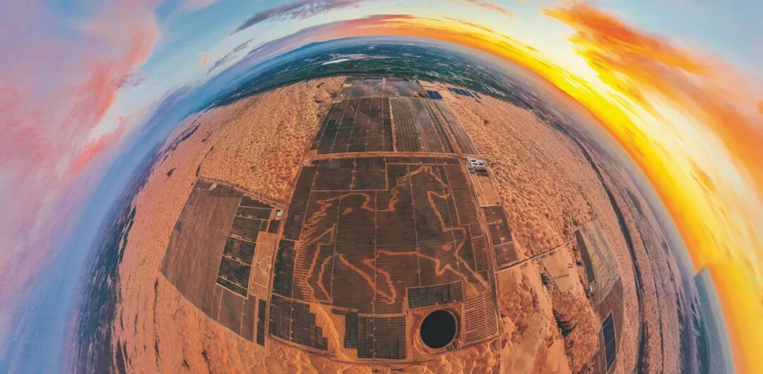 2022年7月16日,位于内蒙古达拉特旗的“骏马”光伏电站被夕阳映照成金色。这座坐落在黄河“几”字弯南岸的光伏电站被收入“世界最大的光伏板图形电站”吉尼斯世界纪录。