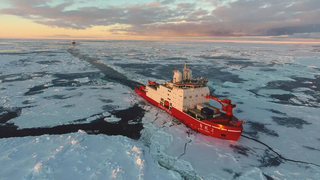 点评:低角度阳光照耀色彩瑰丽的“雪龙2”号科考船破冰前行,远处“雪龙”号微小的形象与前景船只遥相呼应,尽显极地的广阔与壮观。