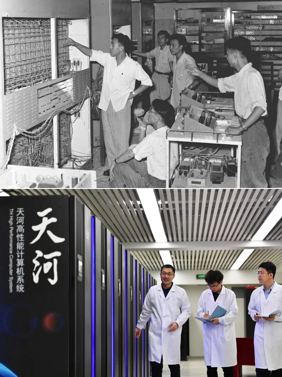 下方彩色照片,科研人员表情自信,计算设备机箱与机房天花板形成从天到地的良好视觉秩序。