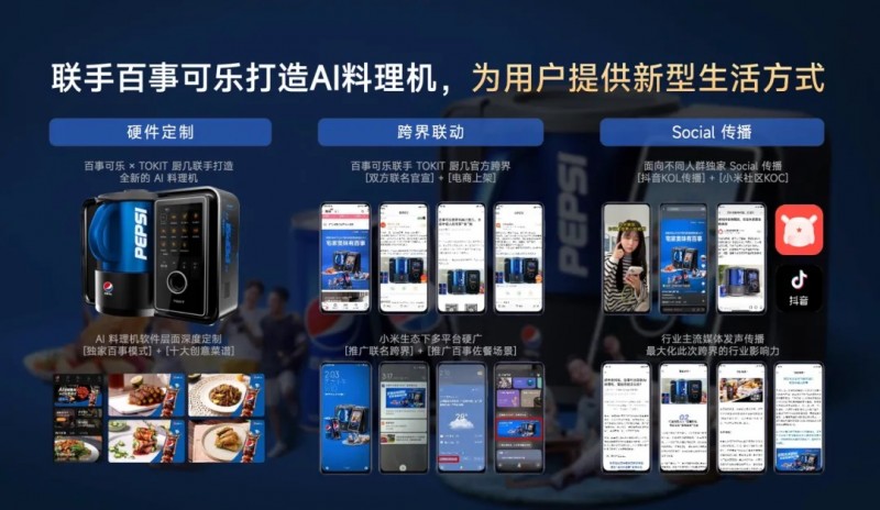 在生活场景,品牌借助智能小家电进行的创意营销也有不错的效果。比如,百事可乐就把广告打在了TOKIT厨几AI料理机上。外观上看有百度的视觉logo,软件里深度定制了“独家百事模式”+“十大创意菜谱”。再辅助社媒传播、电商上线,以及小米生态下的一系列曝光,通过小米达到了现象级传播效果。
