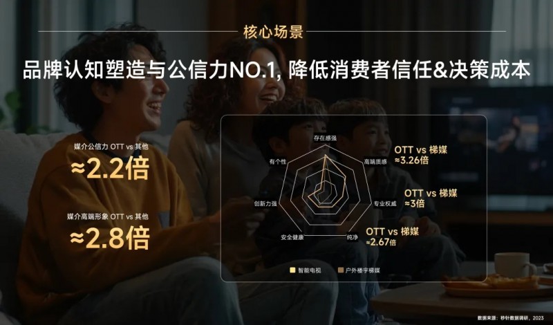 OTT一向被认为是建立品牌认知的重要阵地,凭借视觉、场景的优势,OTT在提升产品记忆度和喜好度方面远超其他媒介,分别是小屏端的4倍和2.3倍,从公信力上来看是其他媒介的2.2倍,呈现的高端形象是其他的2.8倍。