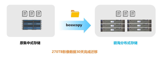 2023年,由于原集中式存储使用年限到期,医院启动历史影像数据迁移工作。通过霄云自研的高速数据迁移软件bosscopy ,仅用一个月时间 就将原有集中式存储中约270TB 的影像文件数据迁移至碧海分布式存储中,实现了历史影像数据的集中统一管理和安全保存。