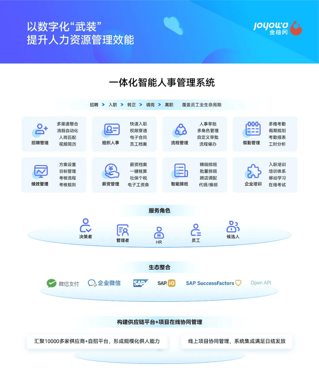 为了更好地服务于企业,金柚网坚持以“人”为本,以“服务”为根,不断外延服务半径,构建贯穿员工全生命周期的人力资源数字化产品与服务体系。并通过专业的技术团队和丰富的行业经验,为企业提供定制化解决方案。人力资源数字化外包服务,涵盖业务外包、招聘流程外包、岗位外包、薪酬福利外包等,还有生成式AI+HR产品,以客户需求为驱动力,全方位满足多种用工需求,立体化赋能企业高质量发展。