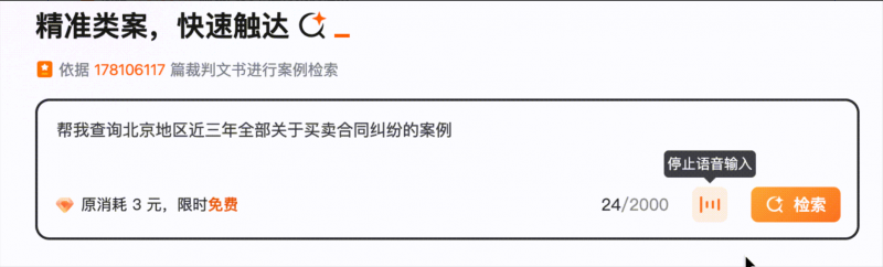 新版功能中,律师甚至连键盘输入这一环节都可省略,只需动口说出查询条件,AlphaGPT便能实时自动识别语音,快速转化为准确文字,并同步开启检索流程。这般便捷功能,不但进一步将检索效率推向新高度,更是为忙碌的律师们争分夺秒,节省下宝贵的时间资源。如此一来,即便律师身处高强度、快节奏的工作之中,也能凭借简单的语音指令,闪电般获取所需关键信息,极大优化了工作流程,让业务处理变得从容高效。