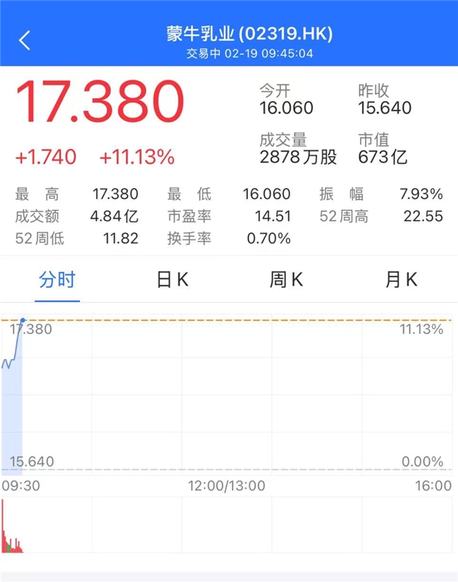 2月19日,蒙牛乳业(HK.02319)以16.06元开盘,相较前一交易日大幅高开,此后一路高开高走,伴随成交量大幅提高,股价一度冲高至17.38元,涨幅超11%,并带动港交所乳制品相关个股集体上涨。