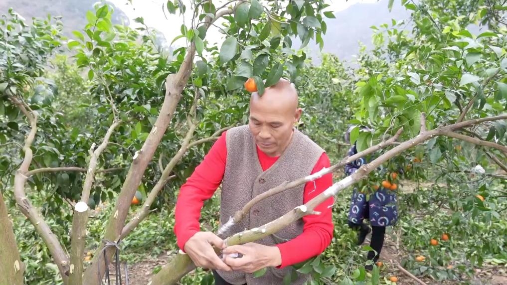 在大山深处,同样火热的生产在田阳区五村镇洞琴村上演。农户们正在加紧嫁接新芽,将沃柑换种为金秋砂糖橘。