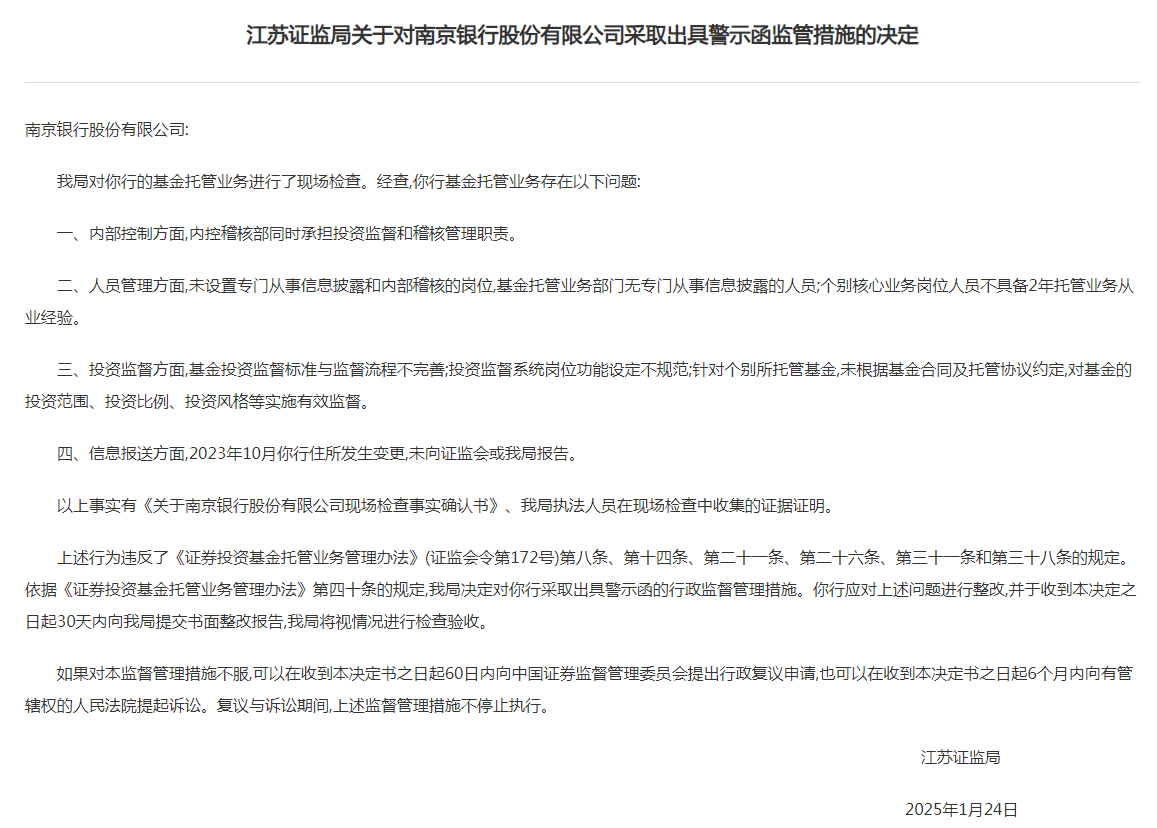 监管文件显示,南京银行基金投资监督标准与流程不完善,投资监督系统岗位功能设定不规范,对部分所托管基金,未按基金合同及托管协议约定,对投资范围、投资比例、投资风格等实施有效监督。此外,该行2023年10月发生住所变更后,未按规定向证监会或江苏证监局报告,信息报送义务履行不到位。针对上述问题,江苏证监局已对南京银行采取出具警示函的监管措施,并要求其在 30 日内提交书面整改报告。