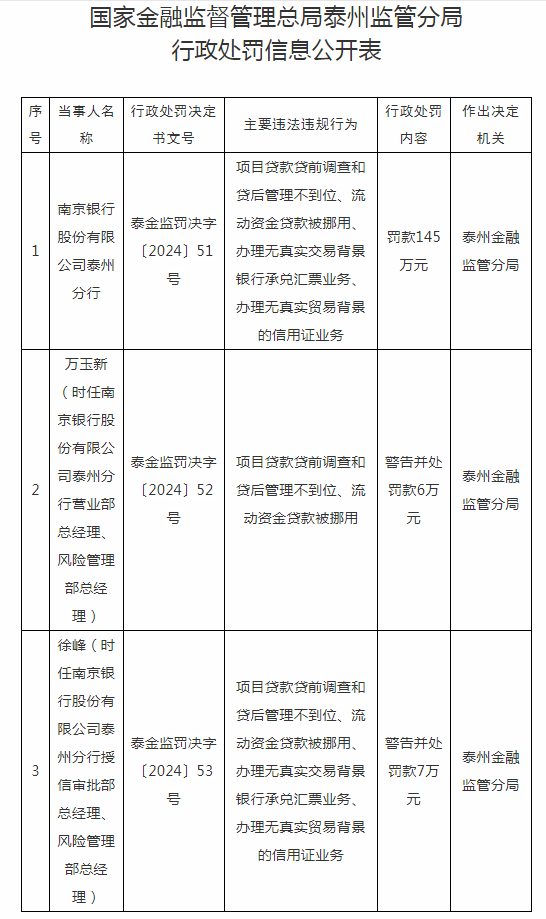 分支机构的违规问题同样集中。1月9日,国家金融监督管理总局泰州监管分局披露,南京银行泰州分行因三项违规行为被罚款145万元。经查,该分行贷前调查与贷后管理严重缺位,导致流动资金贷款被违规挪用;同时办理无真实交易背景的银行承兑汇票及信用证业务,违背 “贸易背景真实性” 原则。