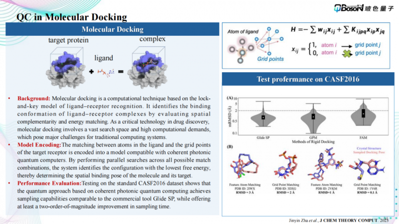 玻色量子将配体原子与靶受体网格点的匹配关系编码为兼容相干光量子计算的模型。通过对所有可能的匹配组合进行并行搜索,系统可识别自由能最低的构型,从而确定分子与靶标的空间结合姿态。在标准CASF2016数据集上的测试表明:基于相干光量子计算的方法达到了与商业工具Glide SP相当的采样能力,同时将采样时间缩短至少两个数量级。