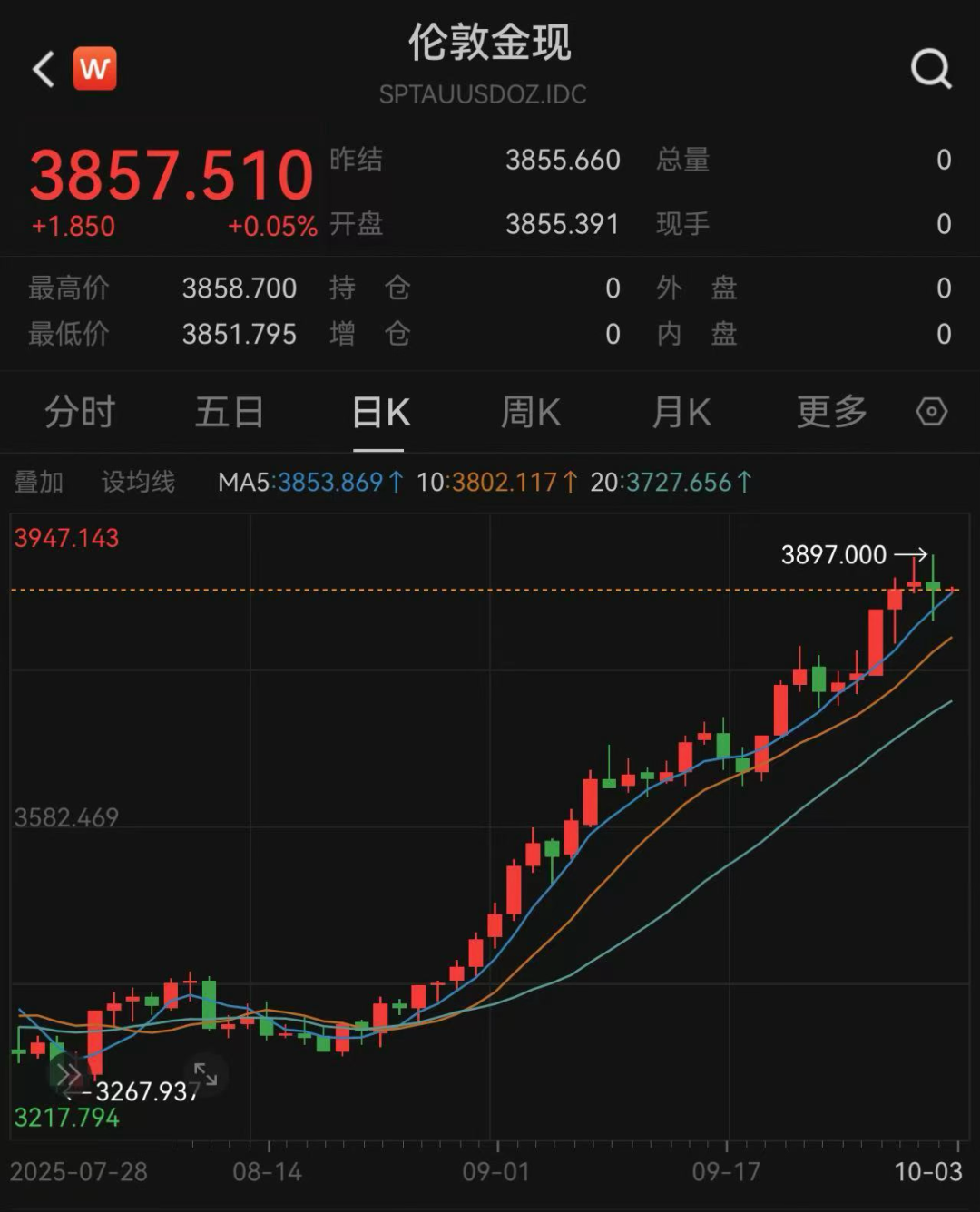 10月3日早盘,国际金价继续小幅上涨。其中,伦敦现货黄金在3850美元/盎司附近徘徊,COMEX黄金期价维持在3880美元/盎司上方。